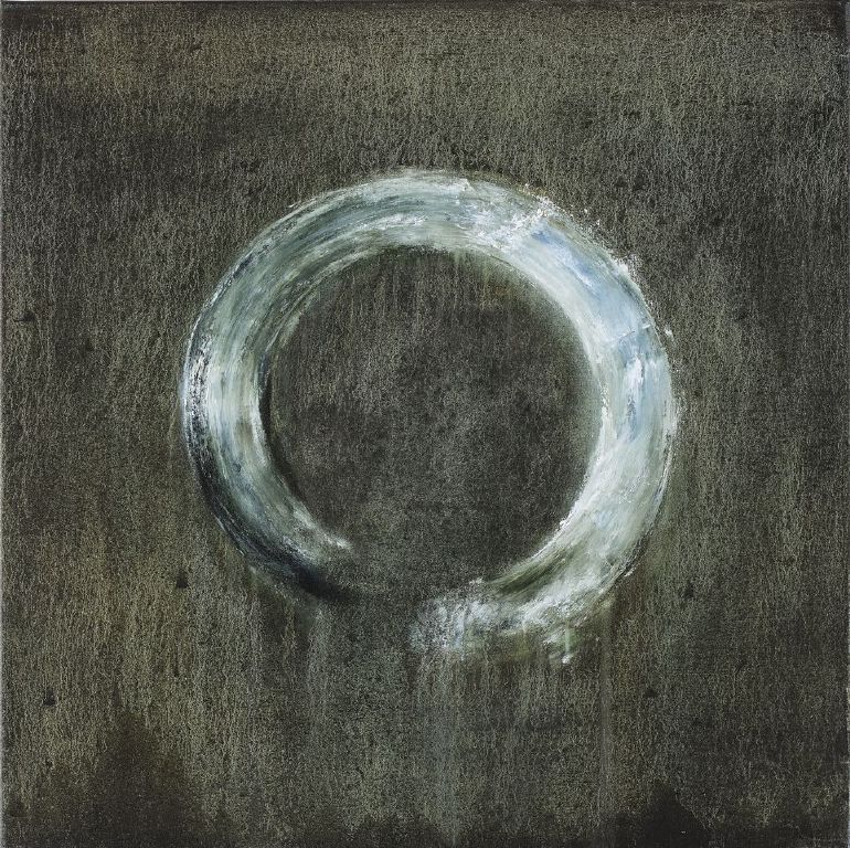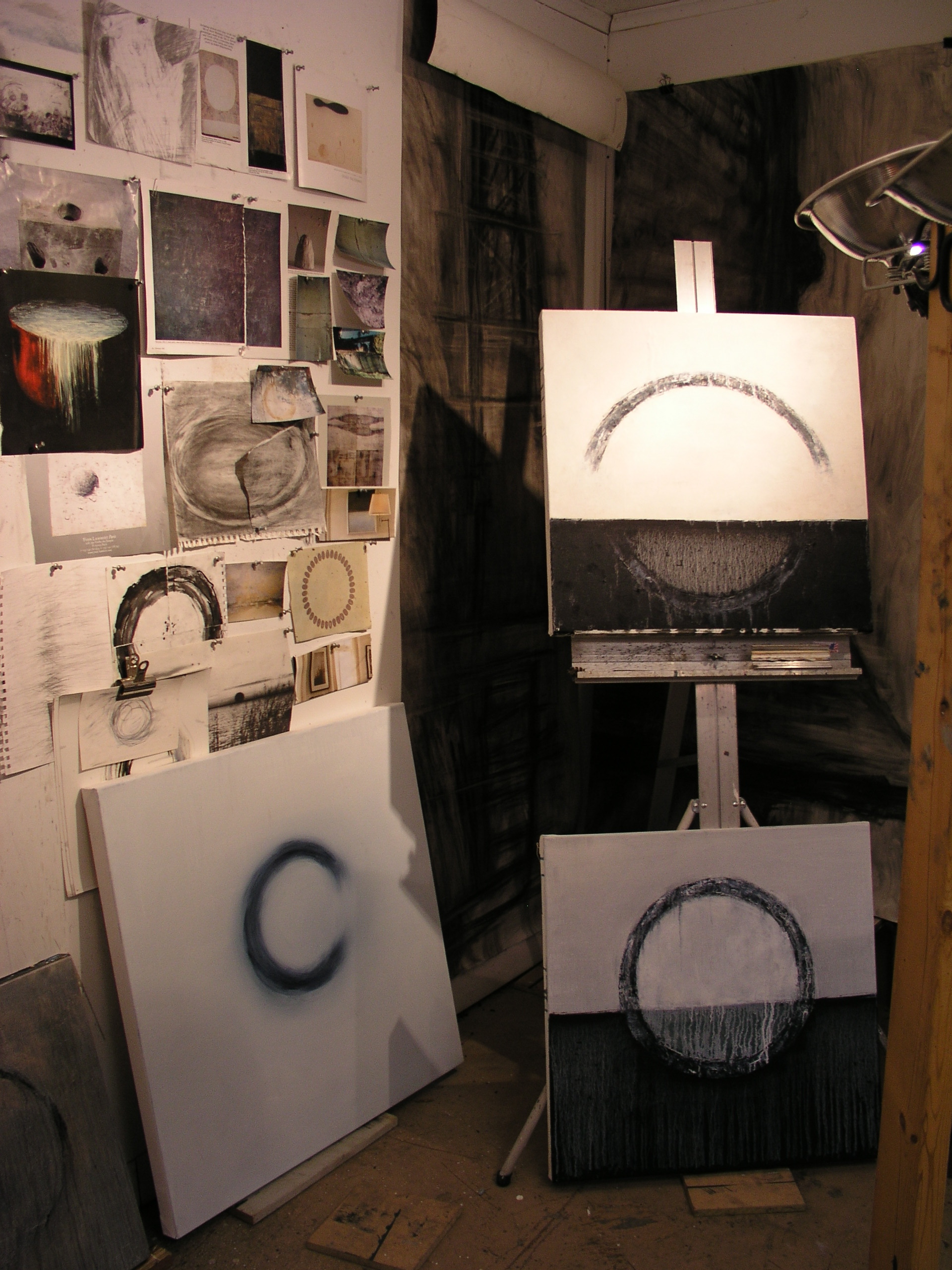 These paintings are studies of a circle in square format.  They’ve evolved from a series I was doing about nests, which had a lot of movement/spin  in them .  They turned into portals with shadows which went minimalist and are now all about the form and the texture.  I had been painting big with a pallet  knife and  I wanted to try to get a bigger emotive effect with less paint.  I also wanted to paint more of the rusted metal and old concrete textures I had done in my original Monument Series (these were land monumnets (to me) of things like old silo bases, rock walls, foot bridges, and barn foundations).